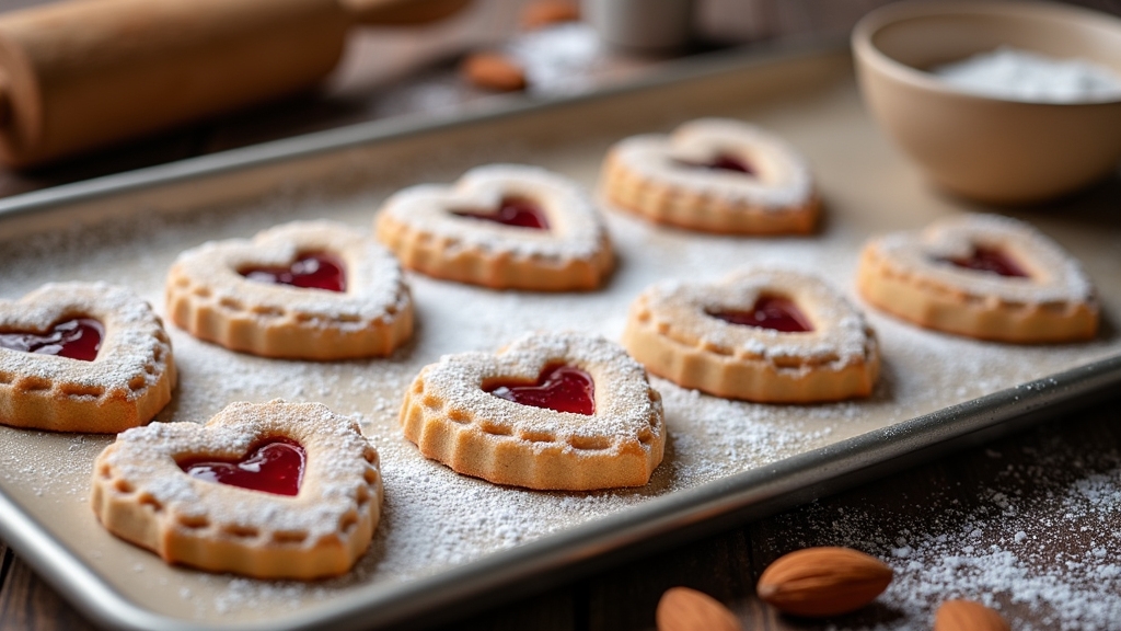 Now that the dough is rolled out to a perfect 1/4 inch thickness, I’m ready to cut out the cookie shapes. I grab my favorite cookie cutters, each one a unique festive design—from stars to hearts, and even classic circles. I carefully press down, feeling the crisp edges of the cutter bite into the dough, releasing the perfect shapes. As I lift each cookie, I can’t help but admire how they’ll look once baked. I lay them gently on the baking sheet, leaving space for them to expand. This is where creativity shines; mixing and matching different shapes adds an innovative twist to the classic Linzer cookies. Soon, these delightful cookie shapes will be the highlight of any festive gathering!